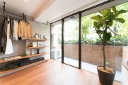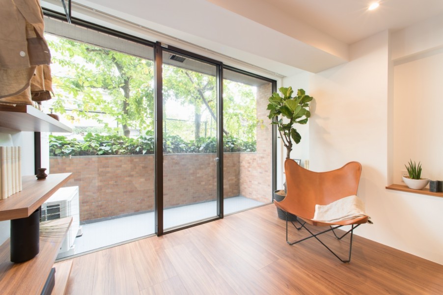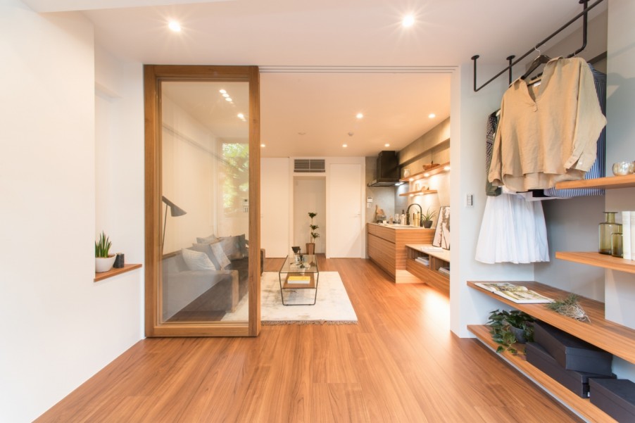 - 2ユナイテッドアローズ社の店舗設計の技術が光るリビングと寝室を分ける木とガラスで制作したオリジナルの建具はゆったりとしたひとつの統一空間を演出するとともに、洗練された印象を作り出します。