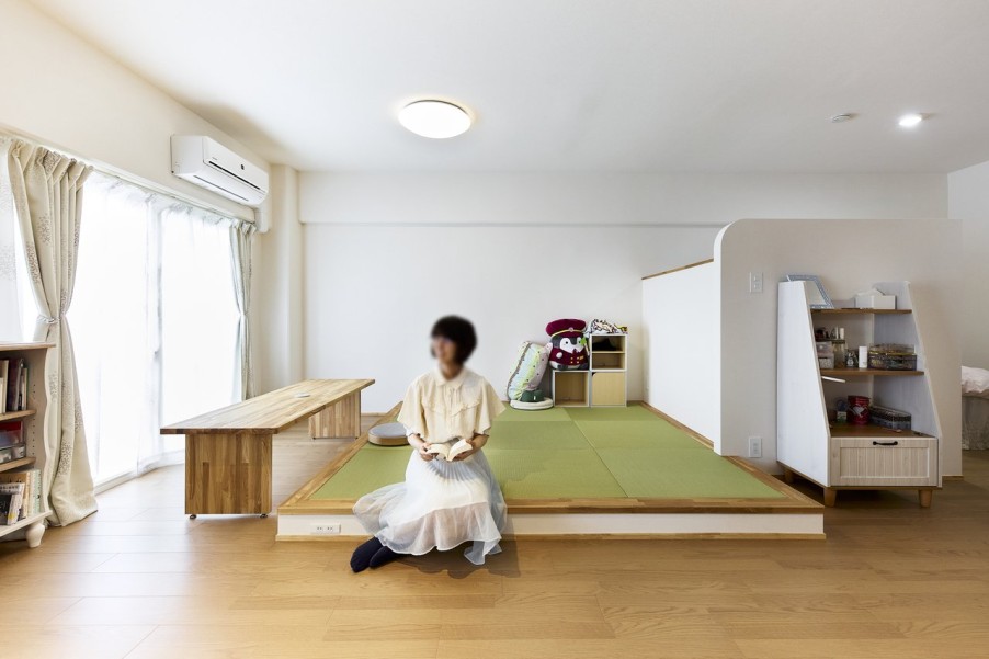 「基本は寝室の隣にあるデスクカウンターで仕事をしていて、体勢を変えたい時に小上がりへ移動します。縁がない琉球畳を提案していただいて、カタログから色を選びました。白やピンクの畳もあって可愛くて迷いましたが、やっぱり畳っぽい色にしたいと思ってこの色に決めました。」(U様)