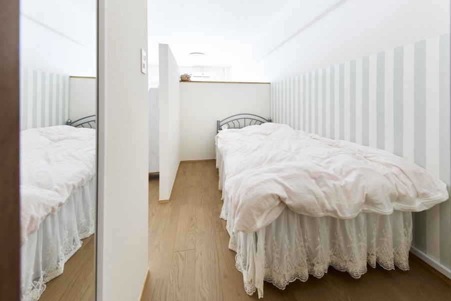 「ストライプの壁紙は、インスタグラムで見つけて『絶対に使いたい』と思っていたものです。イメージ通りのとても好きな場所です。ベッドは前の家から持ってきたものを使っています。」(U様)