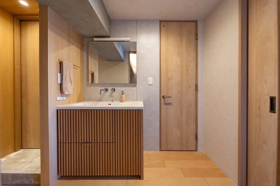キッチンスペースは、三角形に出っ張っていた間取りを活かし、カーテンで隠せるパントリーを新設。冷蔵庫や家電などをすっきり収納できるように設計しました。リブパネルが印象的なキッチンは、洗面台や玄関収納とデザインを揃えて造作。壁面には、ゆらぎのある焼き物らしい質感が印象的なタイルを施工しました。