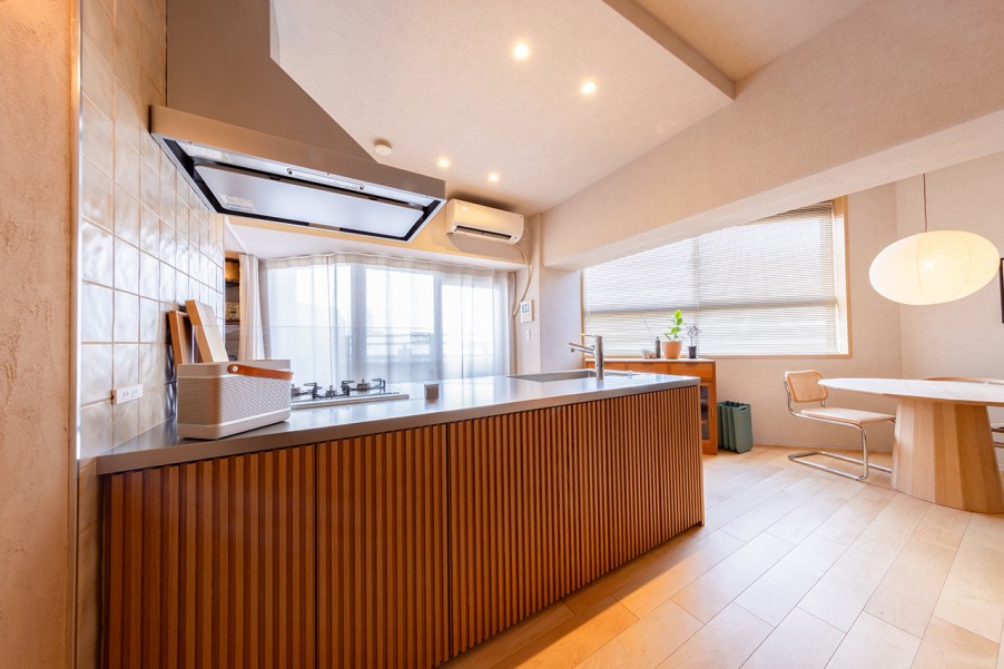 「新築ももちろん嬉しいと思いますが、ここは新築以上の魅力があり、より愛着が湧きますね。前の家では、狭いキッチンで壁に向かって料理をしていましたが、今は料理も掃除もしやすくなりました。友人を招いて一緒にお酒を飲んだり、ホームパーティーを開いたりする機会も増えて、みんなでゆったりと過ごせるのがとても良いですね。」(H様)