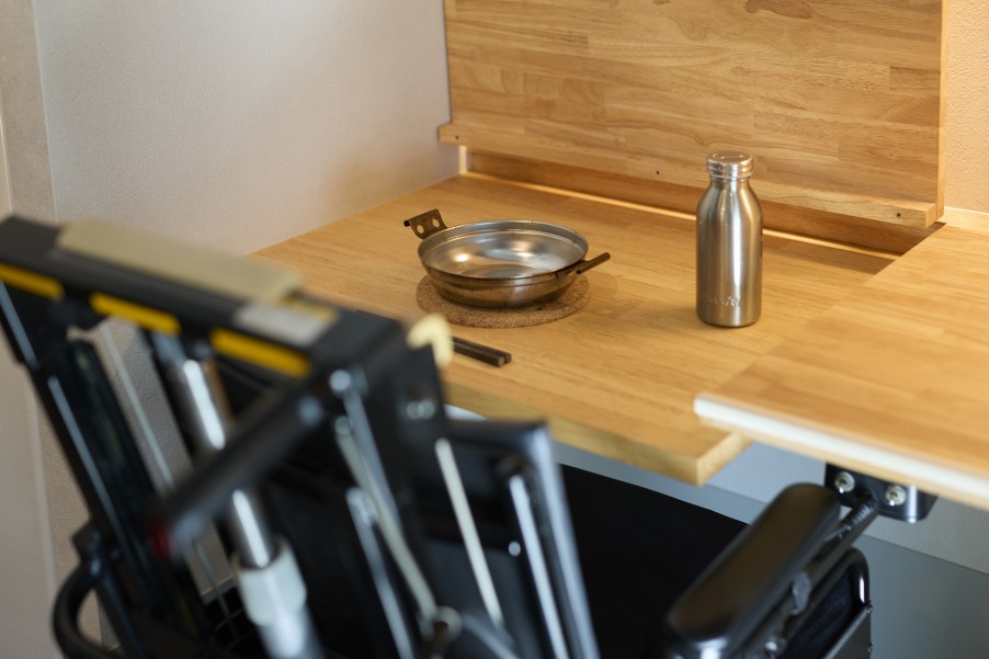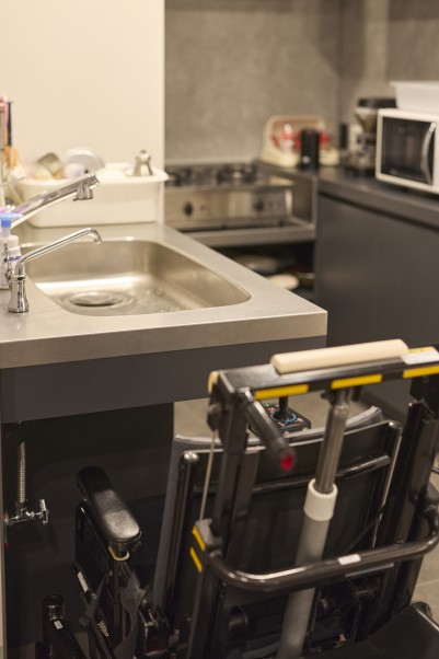 造作キッチンはカウンター下をオープンスペースにし、電動車いすのまま足を入れて歯磨きができる仕様に。リビングの造作カウンターは二段構えで、食事の際に腕を上げやすい高さに設計しました。