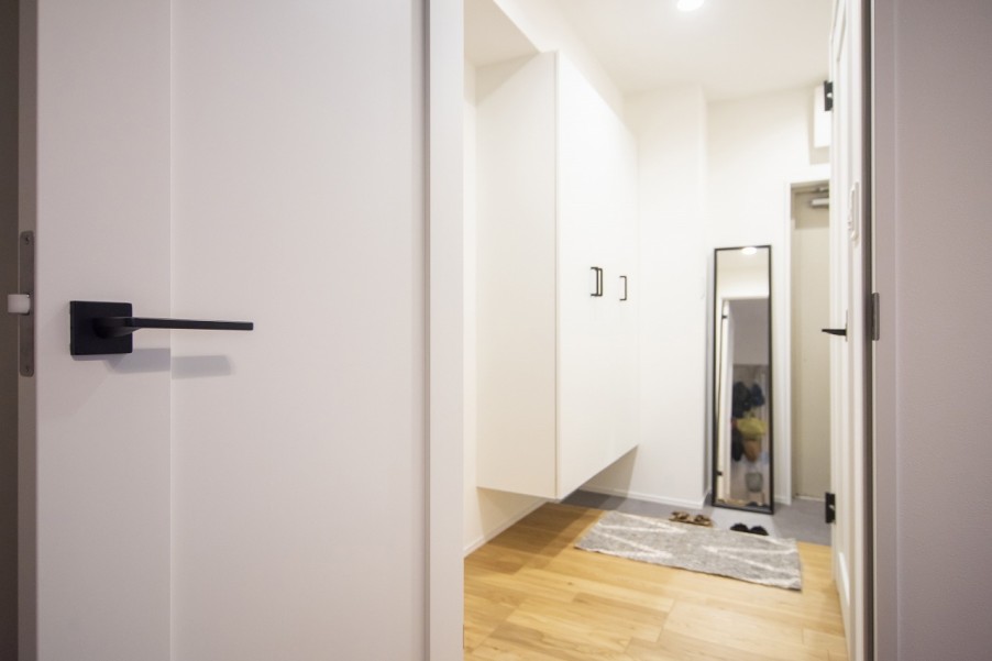 追加で収納家具を購入してなくても良いよう、寝室のクローゼットに加えて、廊下にも収納をつくり、玄関には天井いっぱいのシューズボックスを設けました。