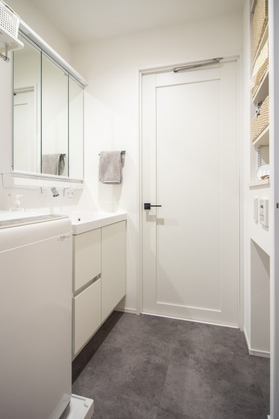 内装は、置きたかったアイアンの家具に合わせて、ドアや収納の取っ手、トイレのペーパーホルダーを黒で統一しています。