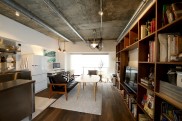 リビングの天井はあえてコンクリート剥きだしにして、排気ダクトを見せる。壁はコンクリートを白く塗り、床には無垢の突板をダーク系に染めたものを張った。