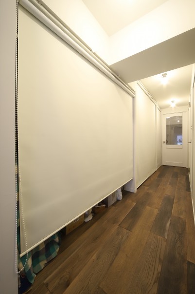- 2廊下の大容量収納スペース土間からリビングに続く廊下を有効活用!片側全てを収納スペースとし、建具ではなく、ロールカーテンで目隠ししました。ロールカーテンを開けると全体が見えるので中に何をしまったか一目瞭然です。