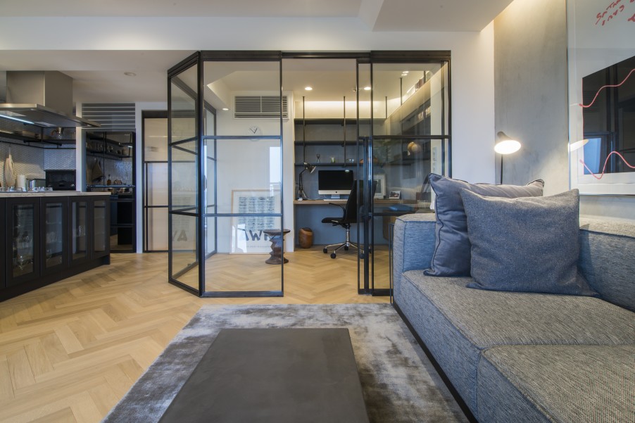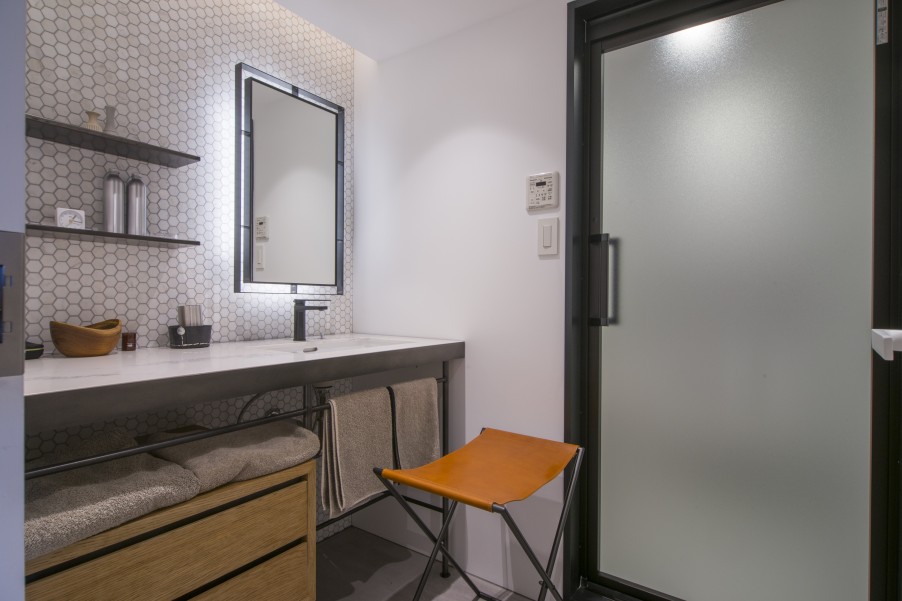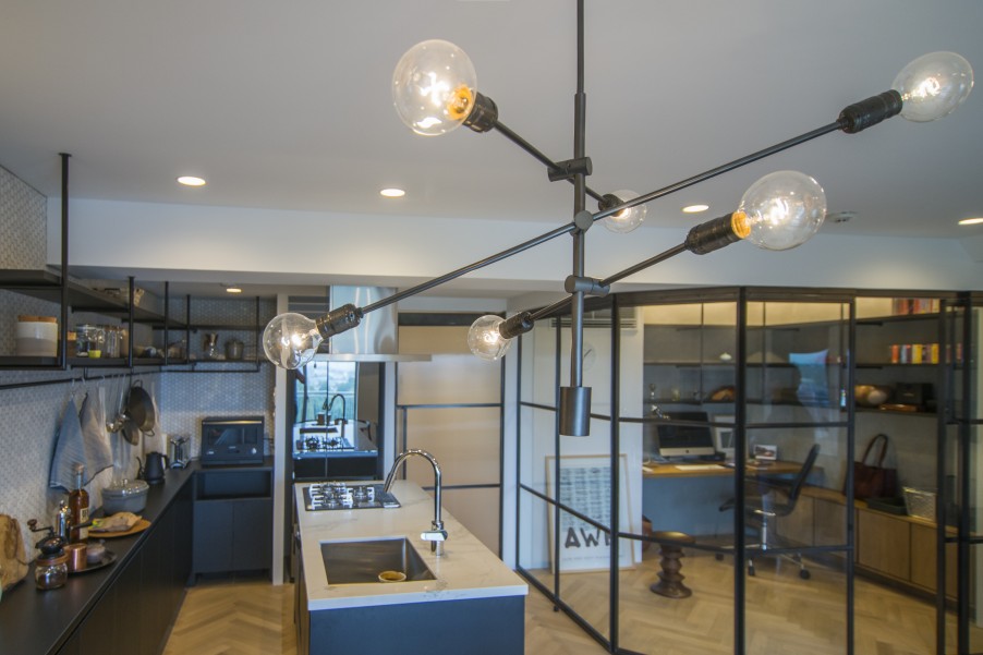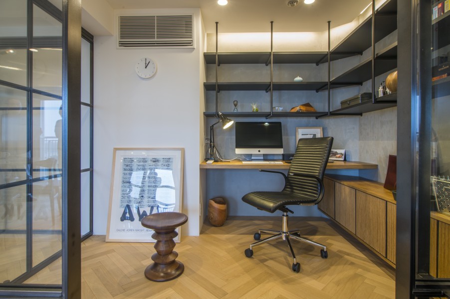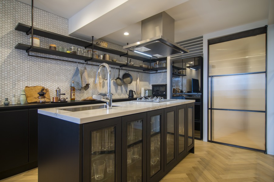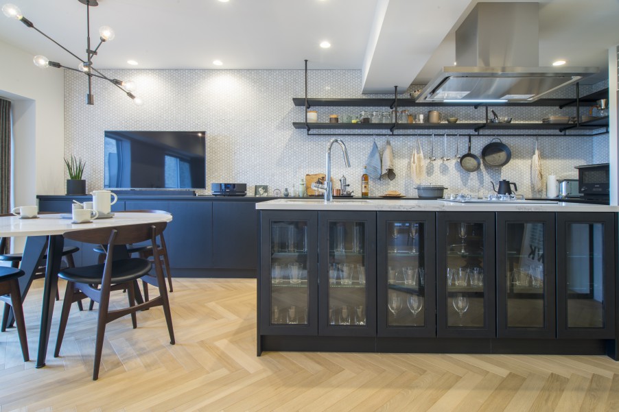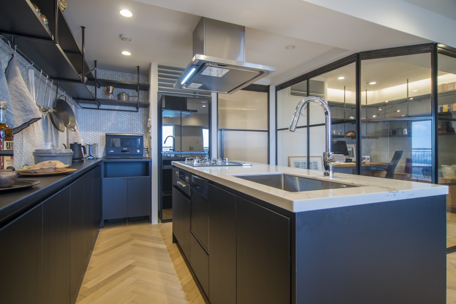 「リビングダイニングキッチンの壁や照明、さらに寝室のウォークインクローゼットも、アイアンとガラスで作られた『見せる収納』を取り入れています。各所、とってもオシャレで素敵ですよね。スケルトン状態から自分たちがオーダーして作っていたとしたら、こんな風にはできなかったと思います。私たちのセンスでは、絶対に作れなかったお部屋だと思います。」(奥様)