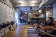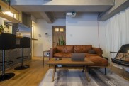 「このサイズのスクリーンを取り付けたかったので、それ用のバーを設置してもらいました。実は、部屋にある梁が、リノベーション時の難点だったんですけど、逆にそれを活かして、間接照明を取り入れただけではなく、インダストリアルな空間も演出できました。これならバーがむき出しでも違和感ないですよね? プロジェクターはなかなか決まらなかったので、引き渡し後に自分で付けました。ほかにも引き渡し後に自分で手を加えた箇所がいくつかあるんです」