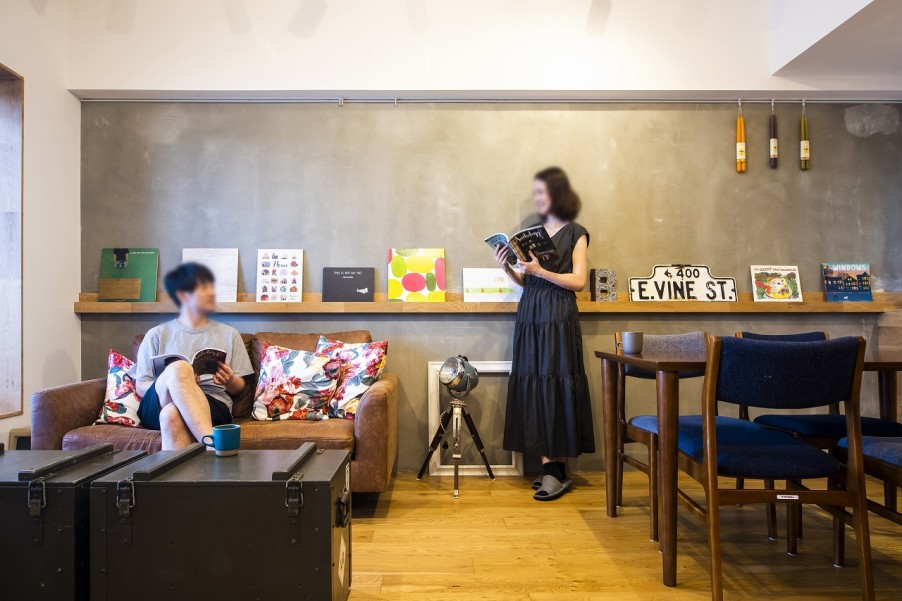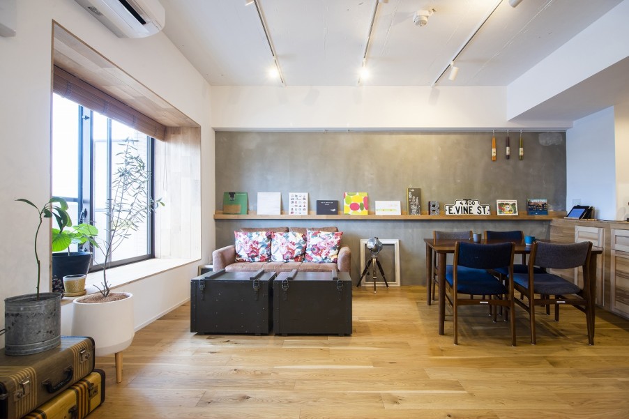 「この物件を内見した際に、設計士さんが『リビングの窓からの景色がこの家の一番の価値ですね。出窓は額縁のように出来そうですね』と言ってくださったのが印象的でした。リノベーションでは、出窓の上下左右にフローリングを貼って額縁のようにし、一番良い景色を額縁越しに見渡せるようにしていただきました。室内にいる時はベンチとして使えて、バルコニーに繋がっているので外に足を出して縁側のように使うこともできます」(ご主人) - 2リノベーションで目指した家のテーマ「テーマは、『非日常と日常のハイブリット』です。カフェのような雰囲気が好きなので、非日常的な楽しい雰囲気や落ち着ける雰囲気を取り入れました。とはいえ、リラックスできる居住空間でもあってほしいので、それぞれの要素の落とし込みを設計士さんに具体化していただきました」(ご主人)