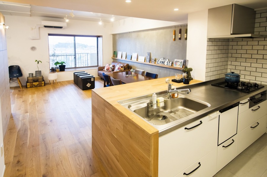 以前のお住まいは昔ながらのキッチンで、奥まった場所にあり二人で入ると狭かったといいます。リノベーションでリビングダイニングを見渡せるオープンキッチンにしたことで、使い勝手や動線が格段に良くなりました。