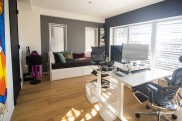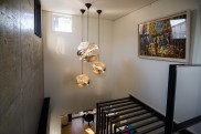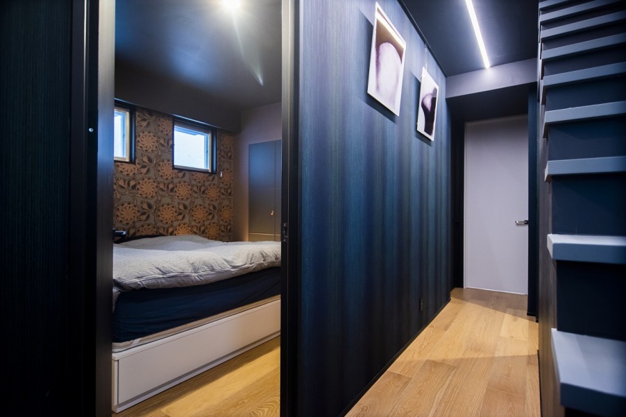 2階には、主寝室と書斎、ゲストルームがあります。各部屋の扉の色を、プライベートスペースは黒、パブリックスペースは白で分けています。光に沿って3階へ行ってもらえるよう、廊下の天井照明は一直線に設置しています。より落ち着いた空間にするため、廊下に黒いカーペットを敷くことを考えているそうです。