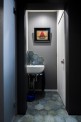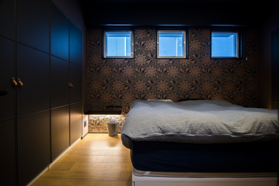 「3階の壁は、統一感が出るように色と素材にこだわりました。ソファを置いているリビング側はダークグレー、キッチン側はブルーの壁紙です。ソファがあるリビング側の壁紙をダークグレーにした理由は、窓の枠が一番上まであるかのような錯視を生み出すためです。夜になると、窓枠が天井まであるような雰囲気になります。カップボード側の壁は、対になっている階段側の壁のコンクリートに合うよう、石のようなブルーグレーのタイルを採用しました。」(Y様)