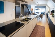 「リノベーション前は壁付けのL字型キッチンがあり、壁面には吊戸棚が備え付けられていました。今はキッチンに小窓が3つありますが、リノベーション前は吊戸棚で窓が1つ隠れていて、暗くて窮屈に感じる空間でした。上部の収納は使いづらいので、収納は全て下に設けています。キッチンの天板には上質感のある薄いステンレスを採用し、天板が浮いて見えるようなデザインにしたかったので、天板の下に2cmの黒い板を挟み、向かいのカウンター側にも座りやすいよう設計しています。この家に引っ越してから、家にいる時間が増え、ほぼ毎日料理をするようになりました。周辺には商店街やスーパー、八百屋などがあるので、散歩をしながら食材の買い物をするのも楽しいです。家に友人を呼ぶことも増えました。」(Y様)