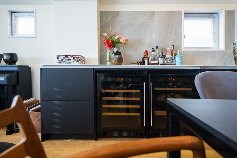 カップボードの一部へこんでいる部分にはワイングラスが収納されており、ダイニングチェアに人が座っていても、椅子を引いてもらうことなく扉を開けてワイングラスが取り出せるようにと、あえて凹凸をつけて設計しました。また、カップボードの扉面材とダイニングテーブルは、マットな黒で統一しています。