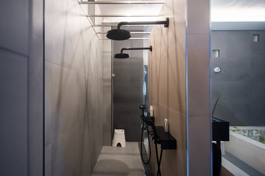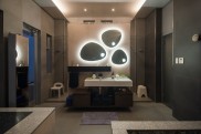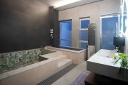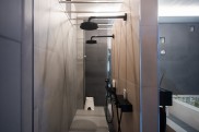 1階の玄関からまっすぐ進むと、大きな浴室エリアがあります。リノベーション前は、広い洗い場にシャワーと一般的なサイズの浴槽があるのみの空間でしたが、リノベーションによってプライベートスパのような空間が完成しました。