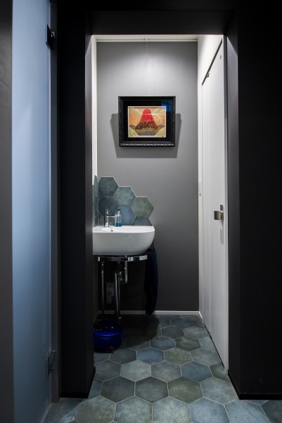 「リノベーション前は浴槽に対して洗い場がとても広く、もったいないと感じる空間だったので、大きな浴槽をつくることにしました。浴槽に使用しているボタニカル柄のタイルは、タイル屋さんで見つけて一目惚れしたものです。岩盤浴スペースはショールームで黒い石材を見ているときに、『岩盤浴スペースをつくろう』とひらめきました。最初からしっかりとプランを決めるのではなく、『自分が使いたいものと出会ったときに、それとマッチした雰囲気をどう作るか』を考えて、逆算してプラン作ることもありました。」(Y様)