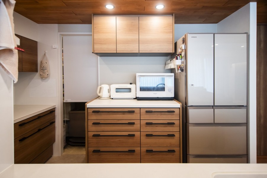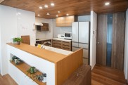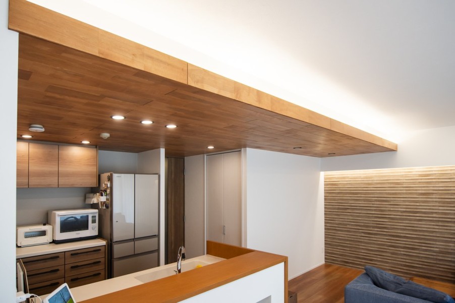 計画当初から天井高を特に気にされておりましたので、無事に天井高が確保でき、キッチンの木天井も圧迫感なくできたことが爽快な気分で嬉しかったです。