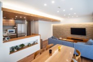 「最初に床の色を今の色に決めました。天井は真っ白にするよりは何か工夫をしたくて、設計担当の方のアイデアで梁をうまく使って床の色と調和する無垢材を貼っていただきました。リビングの壁面には、床と天井に合うデザインのエコカラットを使い、間接照明は設計担当の方のアイデアです。リビングは将来もう一部屋つくれるように施工してもらって、ロボット掃除機やスティック掃除機、フローリングワイパーを収納できる掃除用具入れもつくりました。」(ご主人)