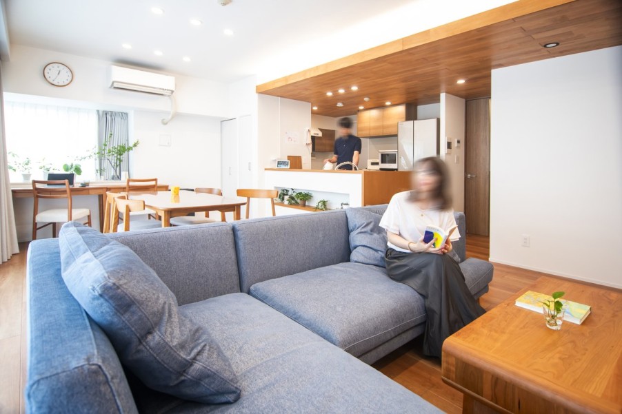「前の家ではソファにダイニングテーブルを置いて、狭い空間でご飯を食べていました。今は大きなダイニングテーブルを囲んでご飯も食べやすくなり、家族の時間が増えました。子どももリビングで遊ぶことが増え、子ども部屋をつくったことで『リビングで遊んだおもちゃは、自分の部屋のおもちゃ置き場に片付ける』という習慣ができました。リノベーションで自分たちの好きな間取りにできるのは最高だと思います。室内は新築同様なので、マンションの築年数は関係ないと思いました。」(ご主人)