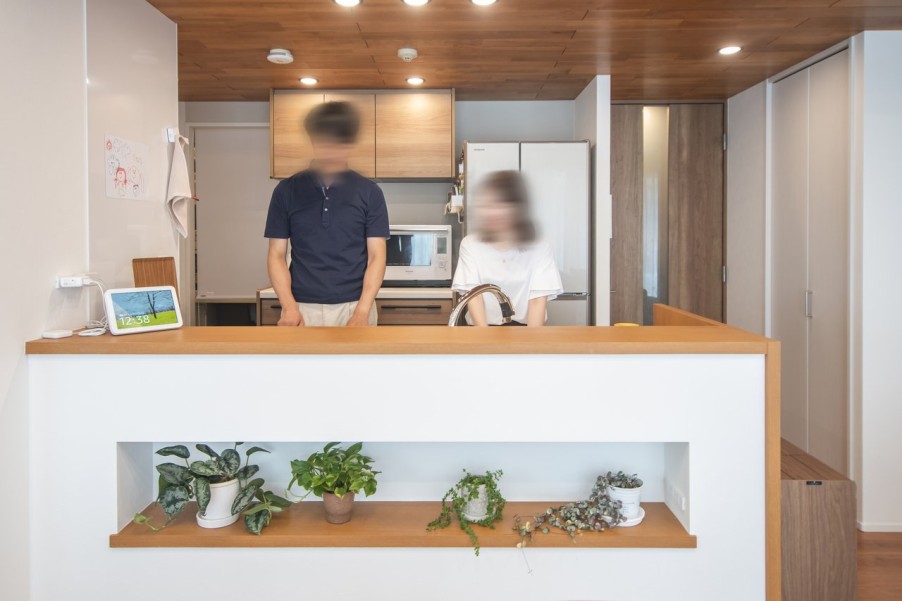 「壁に調味料を置くニッチをつくり、私の好きなタイルを貼っていただきました。料理の合間に、ニッチの前に椅子を置いて眺めています。キッチンの天板は熱々の鍋を直接置けるセラミックを選び、キッチンカウンターは作業中の手元が隠れる高さにしています。奥につくったパントリースペースも、たくさん収納できて便利です。前の家のキッチンは狭くて作業がしづらくて困っていましたが、今は家族4人分のお皿を並べられる広いスペースができ、料理が楽しくなりました。」(奥様) - 3楽しく快適なおうち時間お引越しをされてから、生活や気持ちの変化があったというT様。
