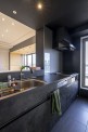 生活動線の良い3LDKの間取りやリビングの折り上げ天井など、すでに凝ったつくりの物件であったため、リノベーションでは既存を活かしつつ内装デザインを一新しました。設計打ち合わせのヒアリングでは、H様が理想とするキッチン写真を拝見し、和モダンなホテルをイメージして木の縦格子をあしらったデザインを提案させていただきました。玄関や廊下、洗面室、キッチンの天井や壁は締め色となる黒のクロスを採用し、明暗のメリハリをつけた空間となっています。