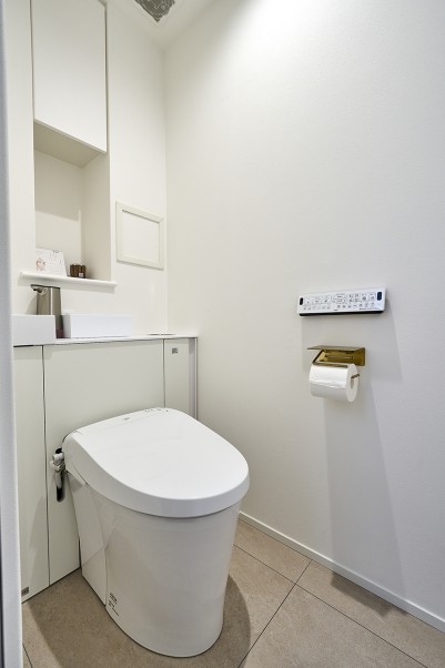 洗面室には、洗濯かごや小物を収納できるスペースを設け、できるだけ生活感を抑える工夫を取り入れました。また、洗濯・乾燥・アイロンがけ・収納までの一連の動作を効率的におこなえるよう、洗濯動線も考慮して設計しました。