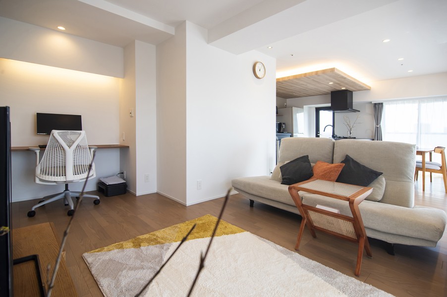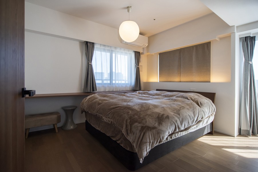 また、服の多さに対応するため大きなウォークインクローゼットを新設。さらに、リビングの一角と寝室にはカウンターを備え付け、テレワークスペースやお化粧スペースとして活用しています。