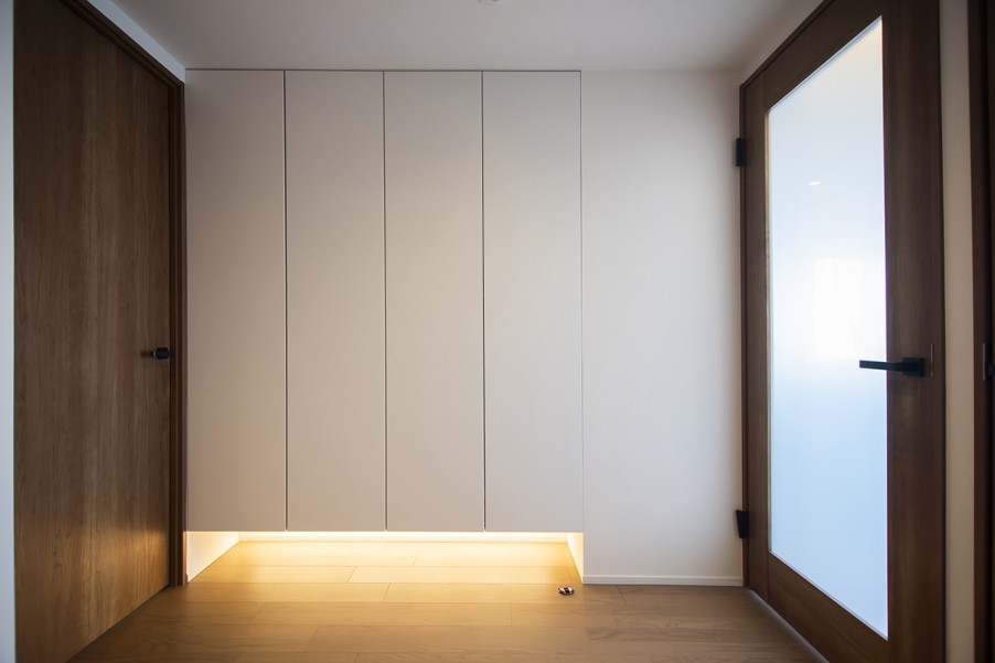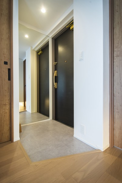 リノベーション前の間取りは、玄関や水まわりが非常にコンパクトな3LDKでした。玄関は、「靴の収納スペースが足りない」というお悩みを解決するため、天井まで届く大容量のシューズボックスを新設。浴室や洗面室も広く確保し、浴槽のサイズや洗面カウンターの高さにもこだわりました。
