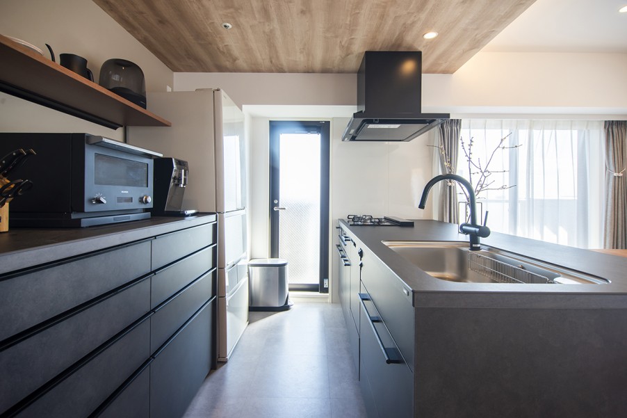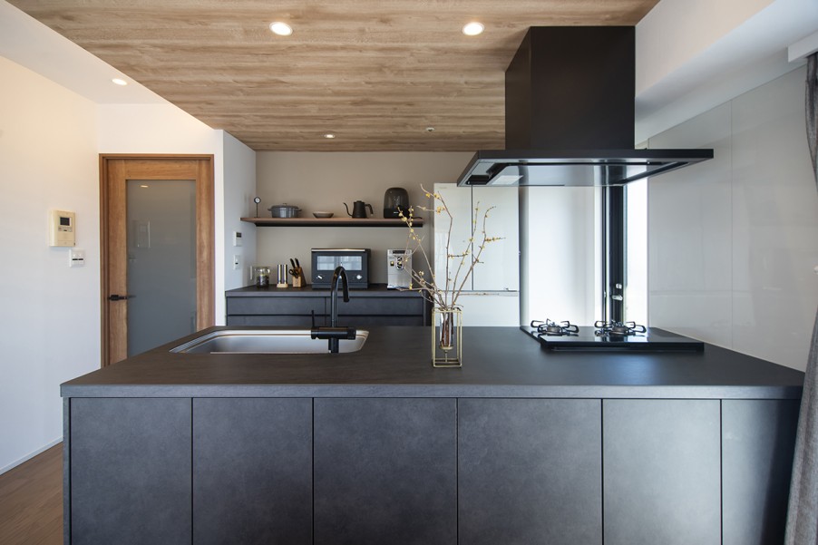 お部屋のテーマは、「木のぬくもりを感じる、居心地の良い家」。Instagramでイメージを探し、キッチンの下がり天井や壁紙、タイルなど、細部まで色や素材にこだわりました。リビングの床や建具、カウンターは木のブラウンで揃え、玄関や水まわりの床、リビングの壁はグレーで仕上げています。キッチンは重厚感のあるブラックを採用し、洗面室やトイレの水栓、各部屋のドアノブもブラックで統一しました。リビング、玄関、寝室には間接照明も取り入れ、柔らかい光の演出で空間にあたたかみを加えています。