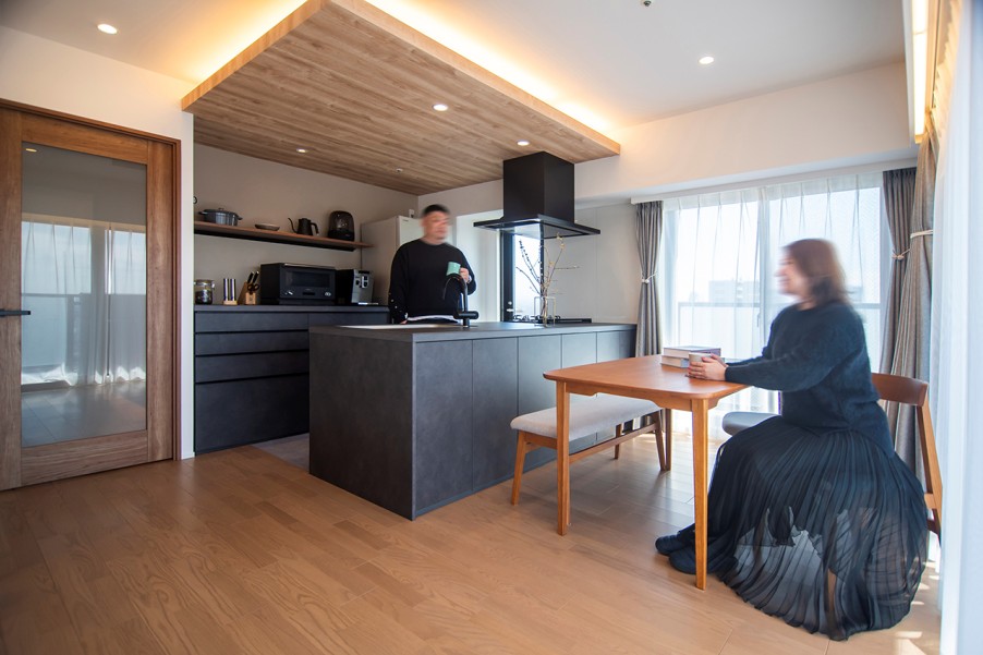壁で仕切られ、閉塞感のあったキッチンは、おふたりで料理を楽しめる大きなオープンキッチンに変更。カップボードはキッチンとデザインを統一し、機能性を重視してフロントオープンの食洗機を採用しました。
