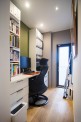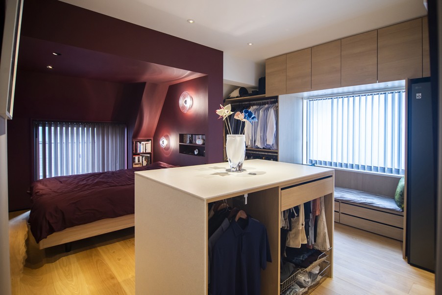 「職場に通いやすいことが最優先でしたが、それだけでなく、家に入った瞬間に『ここだ』と思えるような、ワクワクするポテンシャルを感じられる物件を探していました。なかなかピンとくる物件には巡り合えませんでしたが、『これはいけるかも』と思ったときには、その感覚が正しいかを確かめるために内見していました。この家は、入った瞬間にリノベーションのイメージがすべて湧いたため、即決でした。渋谷や新宿へのアクセスの良さや、友人が近くに住んでいることも決め手になりました。これまでドアツードアで1時間かかっていた通勤時間が30分以内に短縮されて、とても便利になりました。」(Yさま) - 2隠し扉で空間を分けるリノベーション前は、天井が低く梁が目立ち、デッドスペースが多い状態でした。以前お住まいだった177㎡から、今回は約77㎡となるため、限られた空間を最大限に活用しながら、収納をどれだけ確保できるかが大きな課題でした。引っ越しを機に、使っていないものを処分したり譲ったりして、持ち物を大幅に見直したそうです。