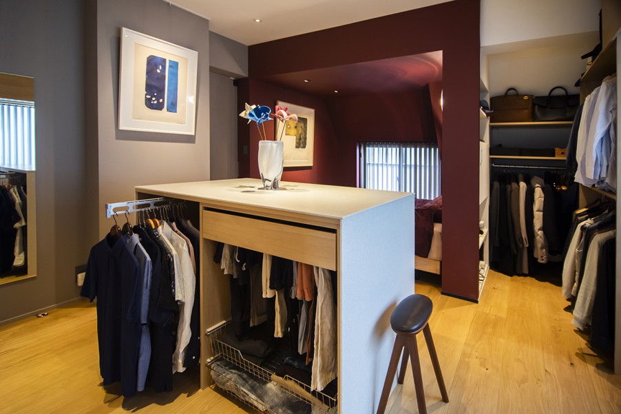 課題だった収納量も、ウォークインクローゼットやアイランド型収納、ベンチ収納を設けることで、季節ごとの洋服がすべて収まるスペースを確保しました。アイランド型収納は、洋服を畳んだり、コーディネートを考えたり、アイロンをかける際に活用されています。