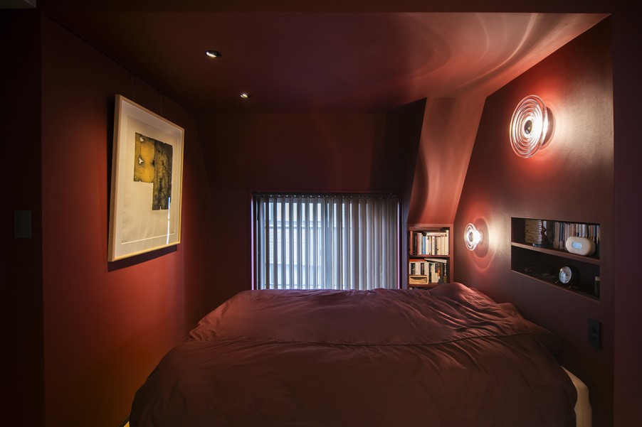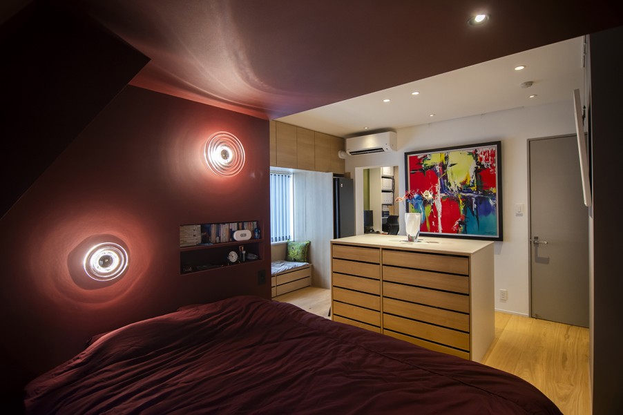 寝室は、斜め天井と梁を活かし、あえて天井を低くすることでコージーな雰囲気に仕上げました。Yさまがどうしても採用したかったというワインレッドのクロスを取り入れ、フランスのアーティストによる絵画も空間に調和しています。