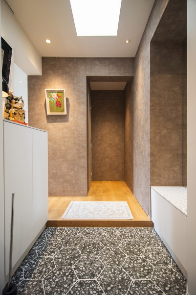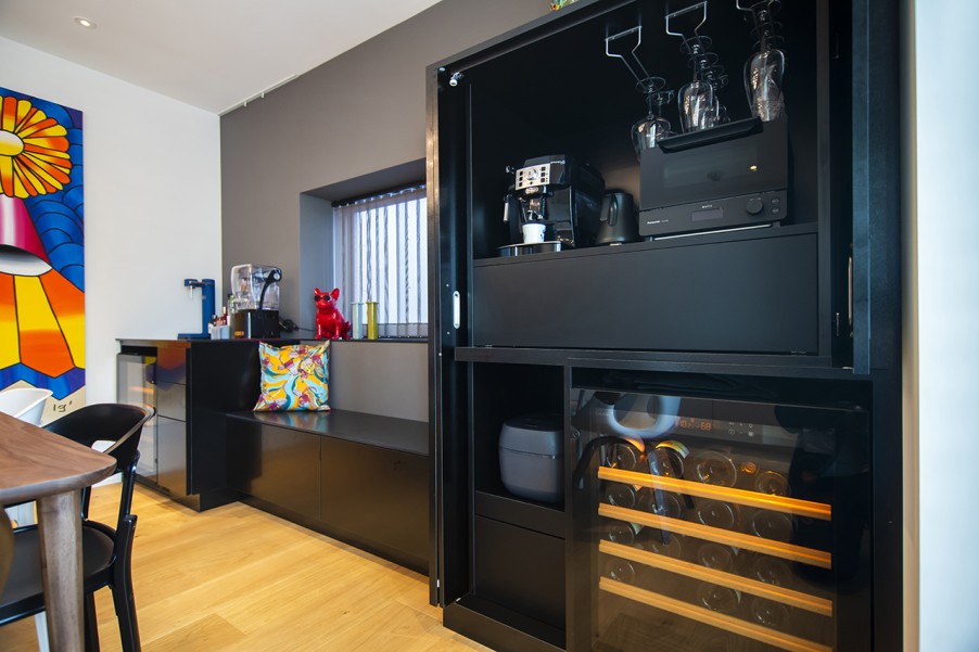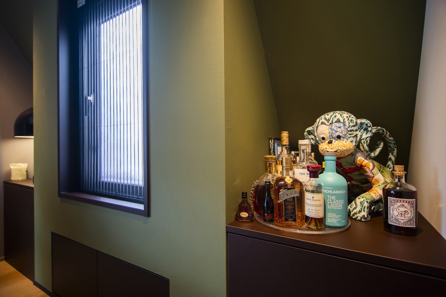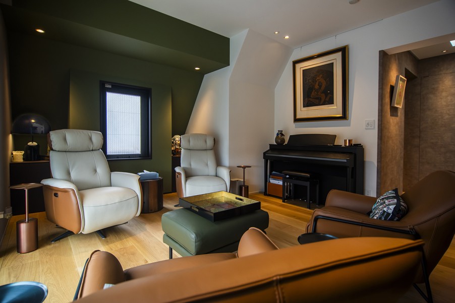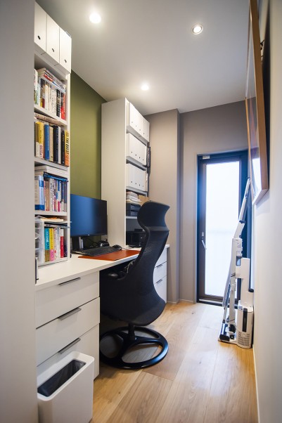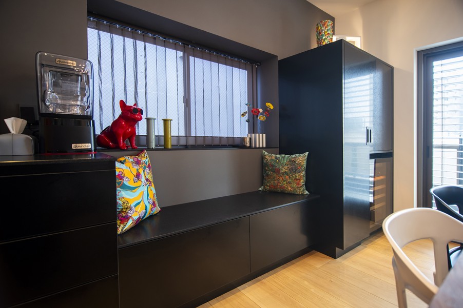 「テーマはこれまでと一貫していて、パブリックスペースとプライベートスペースを明確に分けることを重視しました。玄関を入って左がLDKのあるパブリックスペースで、玄関を入って右がプライベートスペースです。隠し扉を開けると、寝室や書斎、バスルームに繋がります。友人を招いたときもこの扉に気づかず、みんな自然と光に吸い寄せられるようにリビングに向かいます。ただ、日本で隠し扉は珍しいため、設計士は大変苦労されたと思います。例えば、空気圧の影響でドアが完全に閉まらないという課題があり、何度も調整を重ねながら形にしていただきました。」(Yさま)
