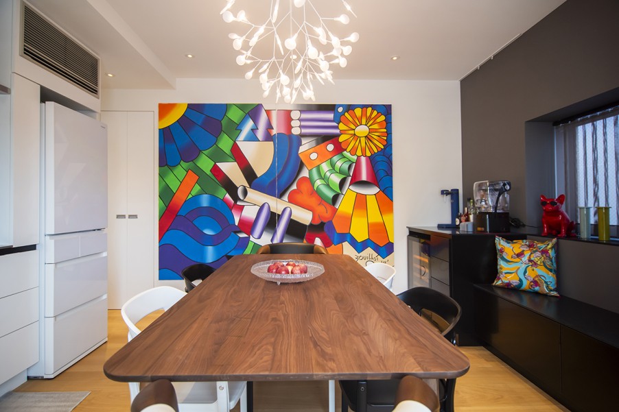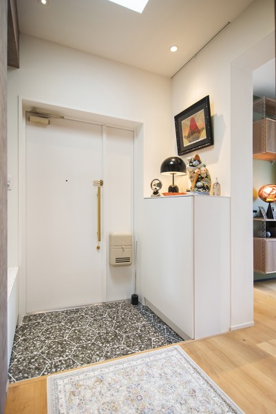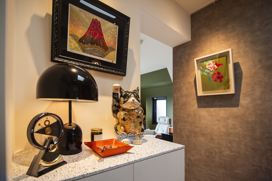「ダイニングに飾った絵画は2つで1セットなのですが、前の家は窓が多く並べて飾れるスペースがなかったんです。どうにかセットで飾りたいと思っていたので、実現できて本当に嬉しいです。他にもたくさんの絵を持っているので、絵を飾るスペースをどう確保するかは重要なテーマの1つでした。持っている絵を1つひとつ取り出して、この絵はここだなと計画しながら配置を決めました。前の家で使っていた家具やワインセラー、食器などは、買主さんの希望でほとんど置いてきたので、真っ白なキャンバスからスタートできる貴重な機会だと思い、新しい要素をたくさん取り込んで挑戦しました。半年ほどかけて家具が揃い、ようやくデコレーションが完成しました。」(Yさま) - 3変化や進化に合わせてアップデート今回のリノベーションは、Yさまのこれまでのリノベーション経験が随所に活かされています。例えば、床材には美術館や商業施設で使われる強度の高い木材を採用。傷がつきにくく、下足での使用にも耐えられる本物の木材を用いることで、見た目の美しさと実用性を両立しました。