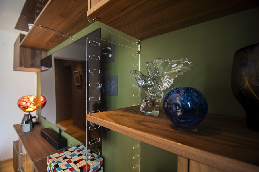 「前回までとは違う色使いに挑戦したいと思い、色選びに時間をかけました。インターネットでグリーンとブラウンを組み合わせたインテリアの写真を見つけて、その相性の良さに惹かれて採用しました。壁面の棚は北欧から取り寄せた『String Furniture(ストリングファニチャー)』のものです。本来は糸で吊るすタイプですが、安全性と圧迫感のなさを重視して、透明なアクリル板タイプを選びました。」(Yさま)