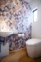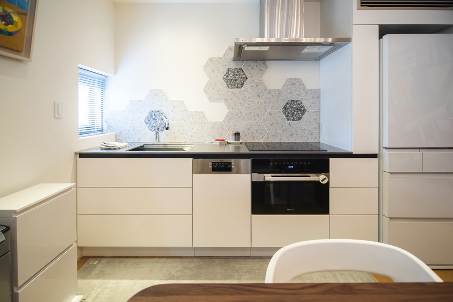 キッチンシンクや壁のタイルにも、これまでのリノベーション経験を活かした工夫が光ります。キッチンシンクは使いやすさを重視して以前と同じ仕様を採用。壁のタイルも以前と同じ六角形のタイルを採用し、新たに花をモチーフにしたデザインを取り入れるなど、さまざまな要素がアップデートされています。