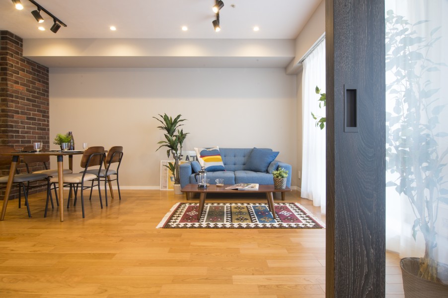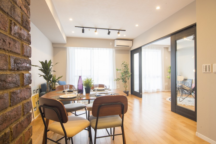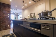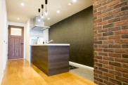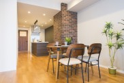 - 1レンガ素材のアクセントをダイニングとキッチンにレンガ素材の凹凸がお部屋に個性を出します。
