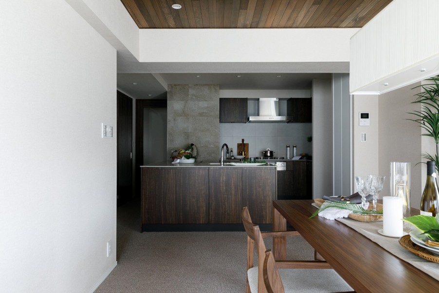 - 1リビングの天井に無垢板を施した温もりのある空間リビングダイニングの天井にはウェスタンレッドシター天然オイル仕上げを施し、玄関とキッチンの壁を石調タイル貼にするなど、木の温もりと石調タイルとカーペットの調和が心地よい素材感の伝わる内装。