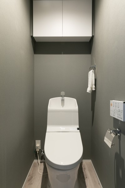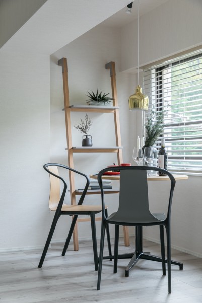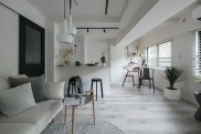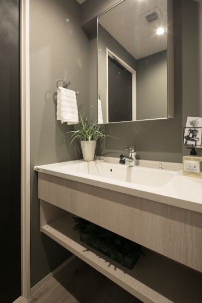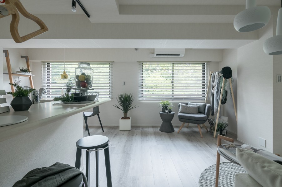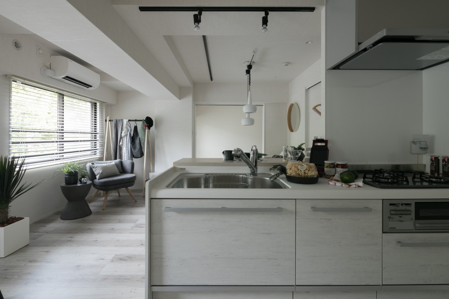 2DK・2点ユニットの水廻りを1LDKに洗面室を独立させて使いやすくなるようにリノベーションしています。また、前面の緑を生かし内部の色は白を基調に自然に溶け込めるようにラフな素材感のものを使用しています。