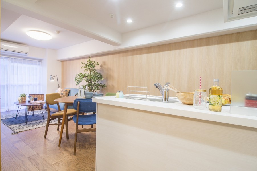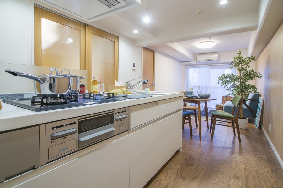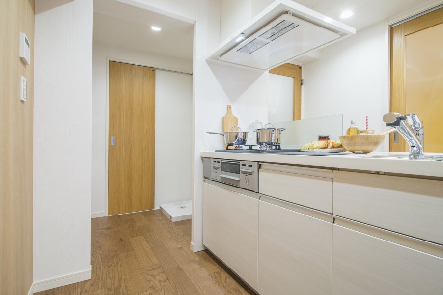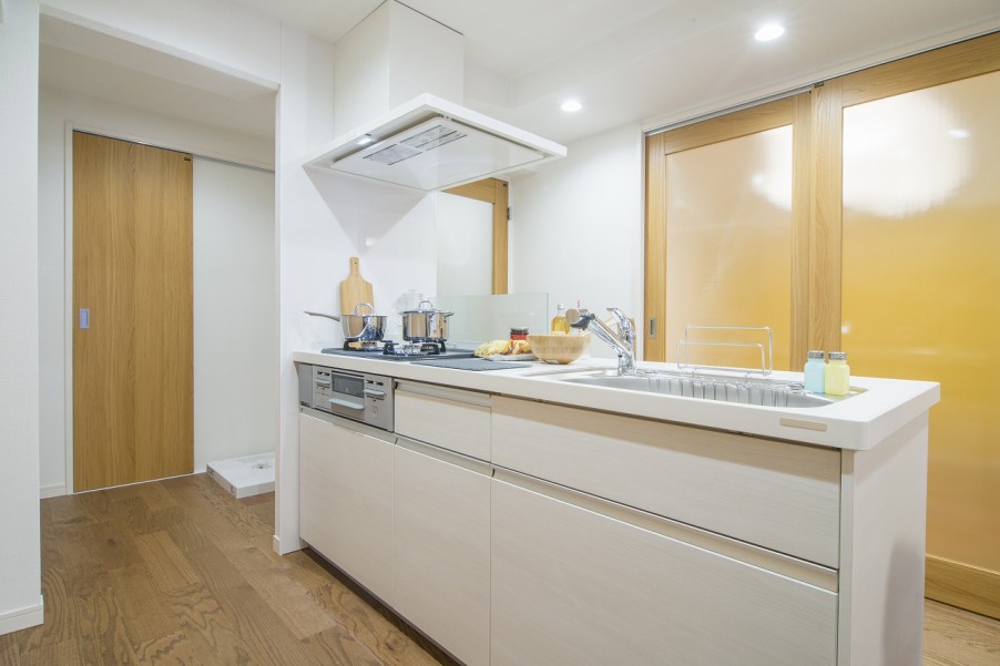キッチンは正面に壁を立てないフルフラット・キッチンを採用することにより