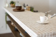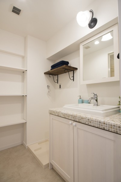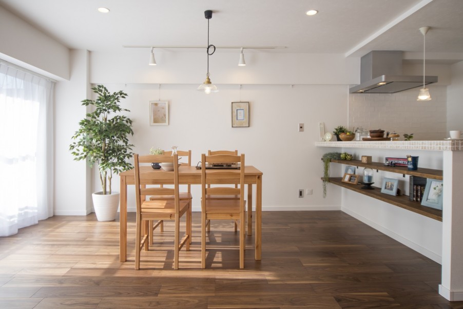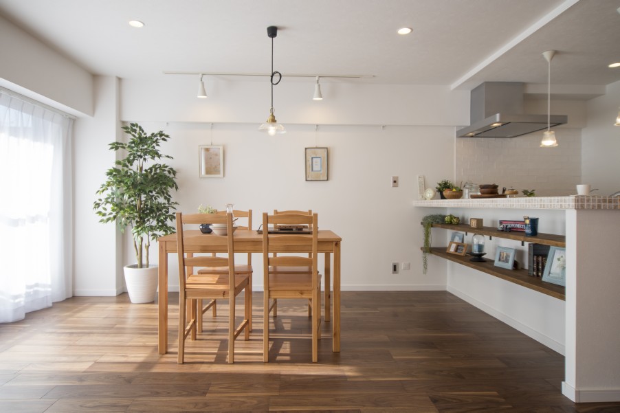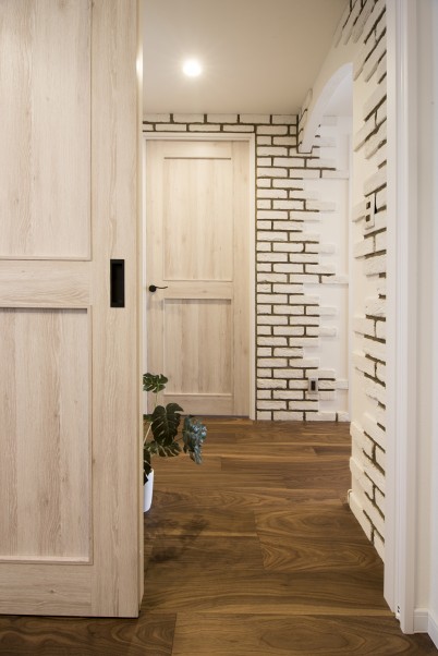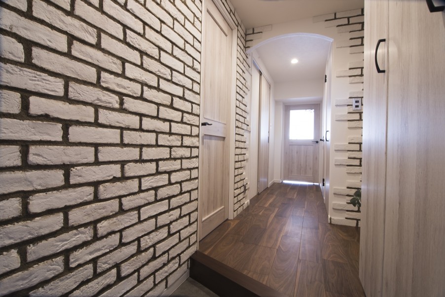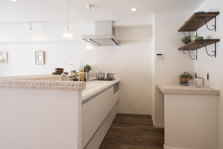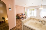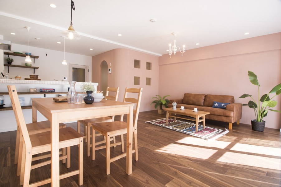 - 1ヨーロピアンテイストLDKスペースには淡いピングの壁、モザイクタイル、廊下に白煉瓦を施すなどかわいらしいヨーロピアンスタイルに仕上げました。