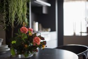 モダンな雰囲気のペンダントライト。ミニマムなグリーンをテーブル中央に吊るすことでテーブルの一輪挿しを引き立たせます。