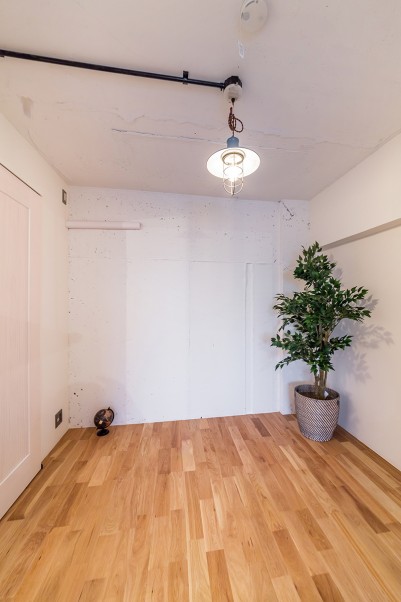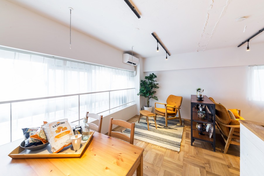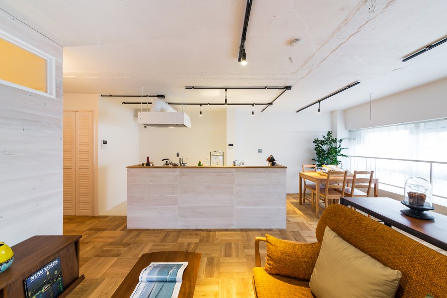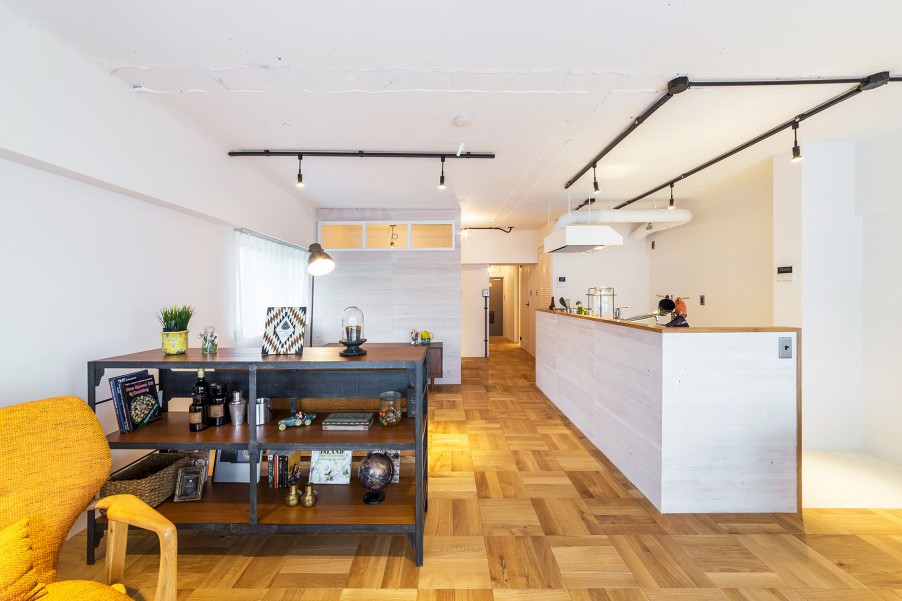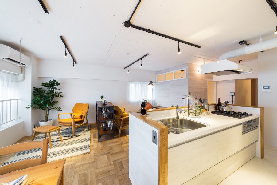 - 1全体的にナチュラルな雰囲気に床は無垢材のパーケットを採用し、天井・壁は躯体あらわしにし、白色塗装仕上げにすることでナチュラルなテイストに仕上げました。