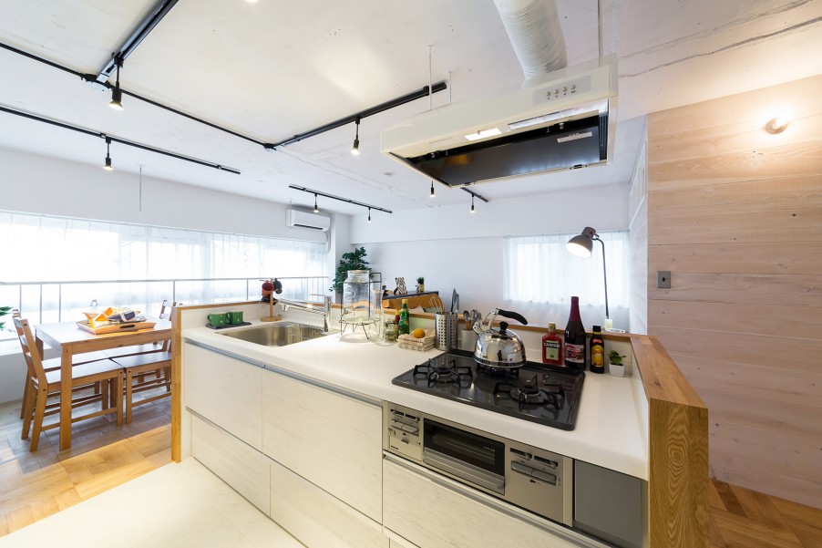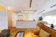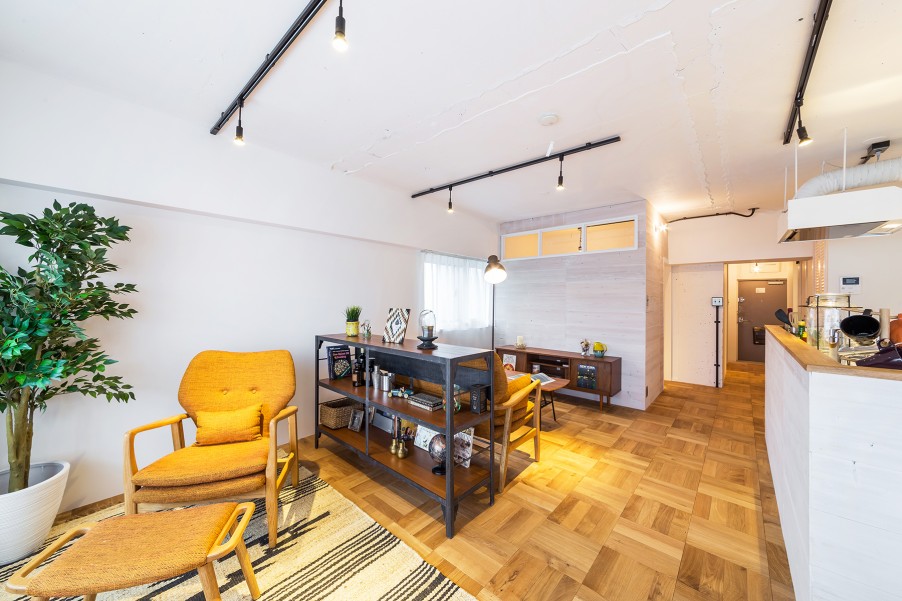 大型のリビングにアイランドキッチン、玄関スペースには広々とした土間、下足入れは扉のない見せる収納、住む人によって使い勝手もさまざまなマルチスペースと、一部の壁を壊せない限られた空間に人気のスタイルを盛り込んだ内装に仕上げました。