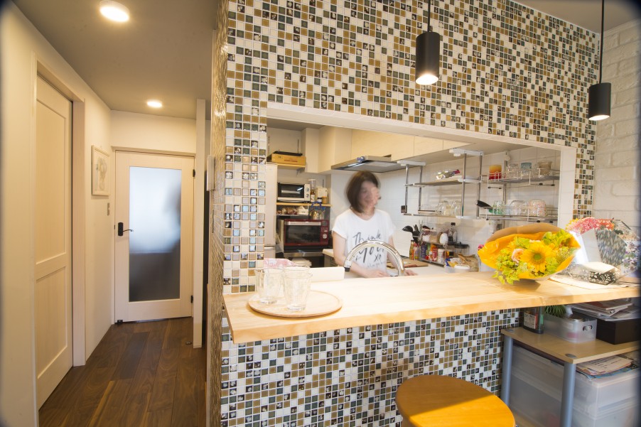 間取りは既存をいかし使い勝手の良い3LDKにしながらも、壁・天井を開放感のある躯体あらわしペンキ塗装、床材や壁には無垢材を使うなど素材にこだわり、リビングの壁面にはタイルを贅沢に施すなど、特徴的なポイントを多く取り入れました。
