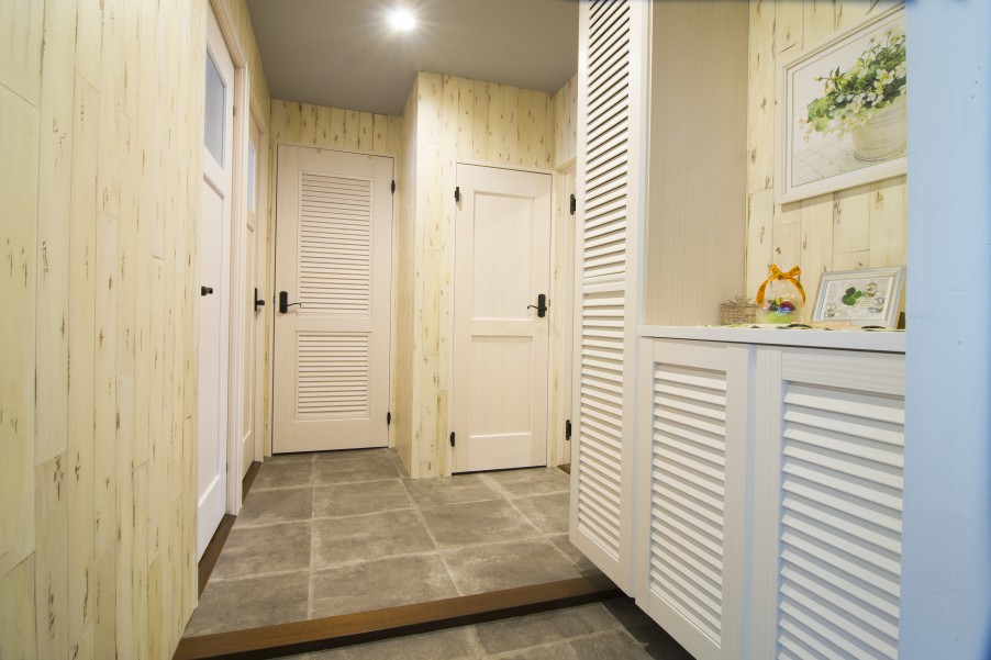 - 1玄関スペース玄関を空けた瞬間にインパクトがあるように、壁と建具を白く塗装した無垢材を使用することで、温かみのある空間に仕上げました。