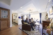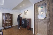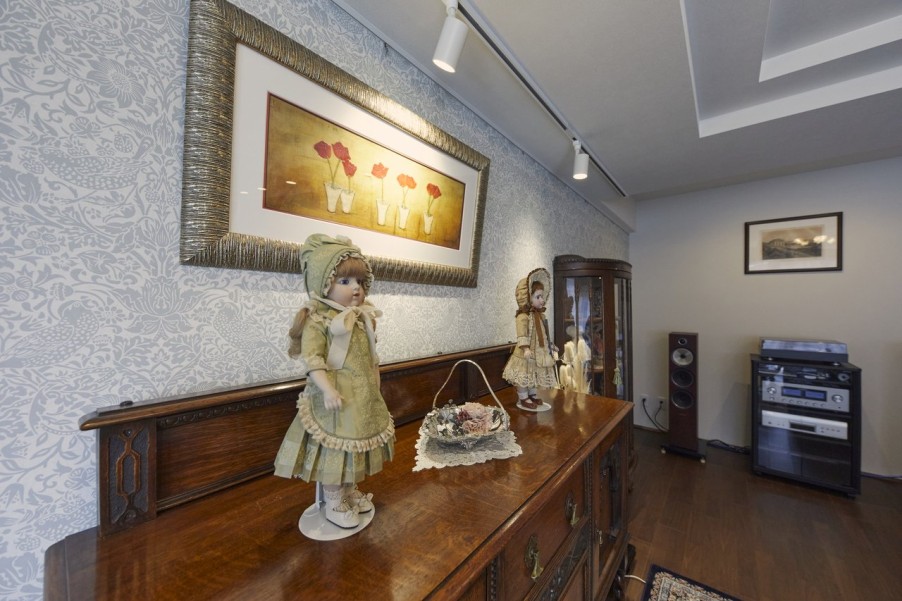 「リビングに置いている2つのキャビネットは、前の家からずっと大切にしているもので、この2つが違和感なく置けるアンティーク調の内装にしたいとお伝えしました。キャビネットの寸法をお伝えしたところ、キャビネットを置いた上にも人形が飾れるように、壁を凹ませたニッチを造作していただきました。遊びに来る娘からは『趣味全開だね』と言われます(笑)」(奥様)