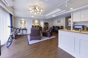 リビングには、ブルーグレーのアクセントクロスを取り入れ、絵画が飾れるようにピクチャーレールとスポットライトを取り付けました。
