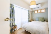 アクセントクロスとカーテンの色がメインカラーとなり、お部屋全体の雰囲気と調和され、まとまりのある空間になりました。リビングと寝室をつなぐ室内窓は、光と風の通り道としても、お部屋のおしゃれなアクセントとしても大活躍です。巾木には木材を使用してナチュラルな雰囲気に、ドアノブはゴールドで統一しているのもポイントです。K様の好きな北欧テイストで、木のぬくもりが感じられるお部屋が完成しました。